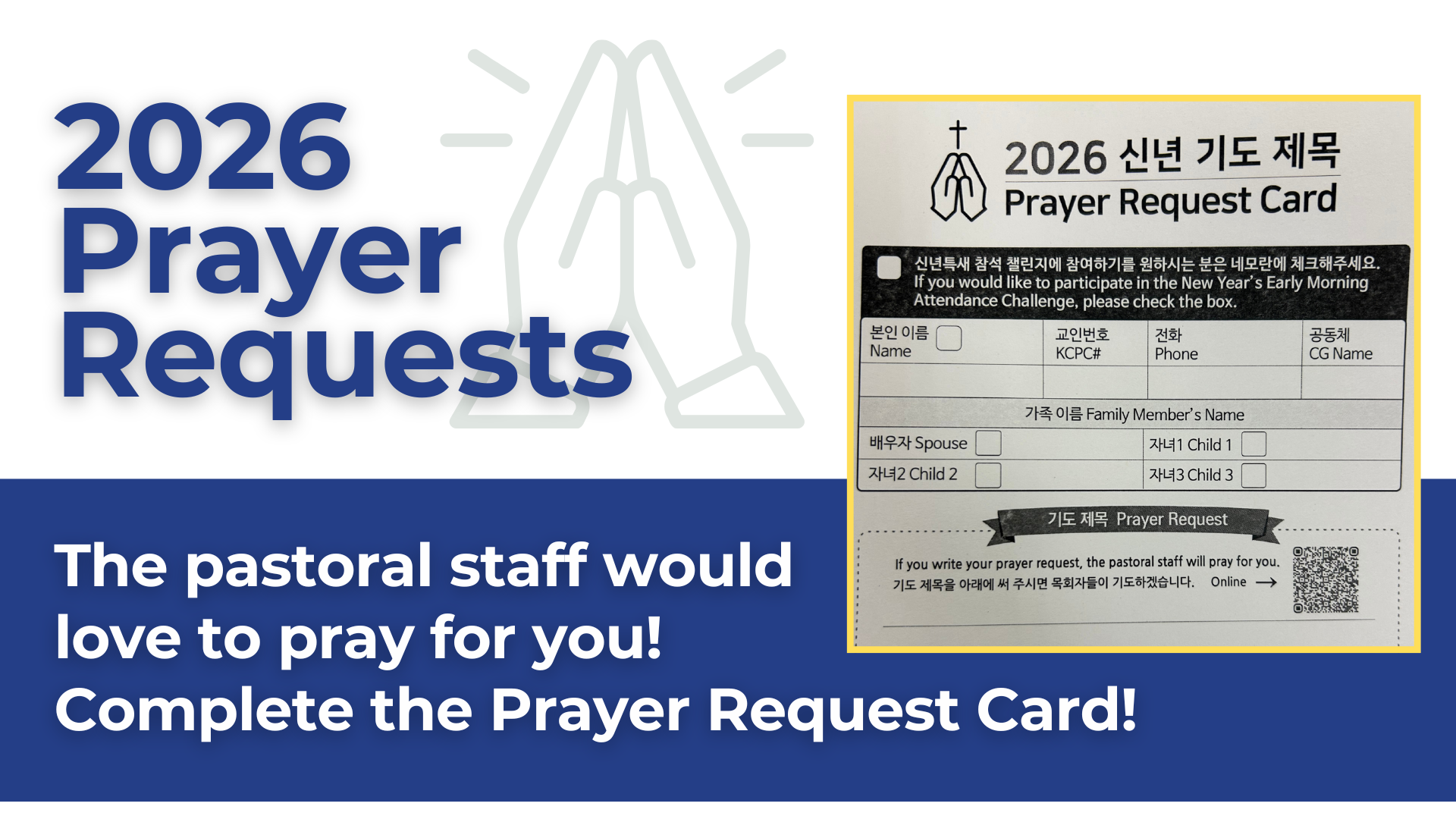 The pastoral staff would love to pray for you! Please complete the 2026 Prayer Request Card with your prayer requests OR use the link below.