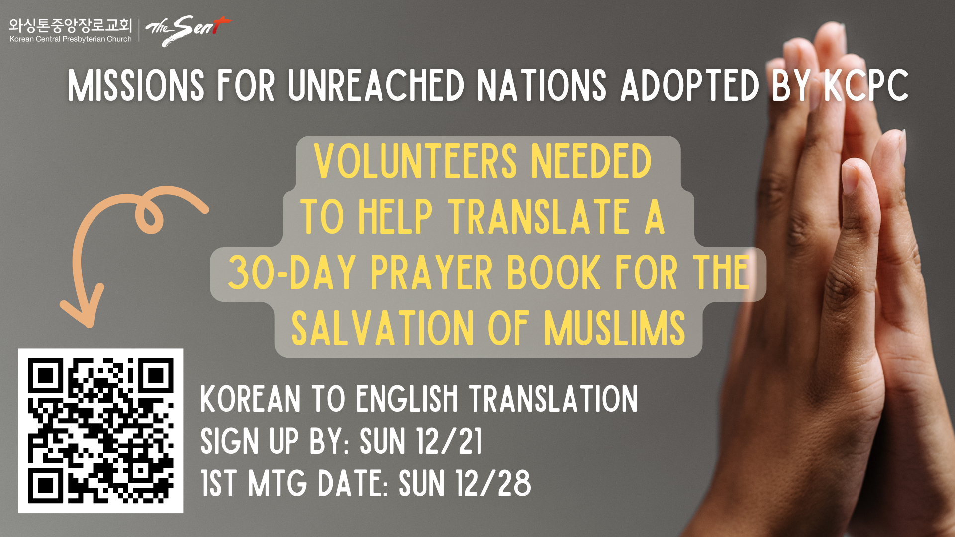 The Missions Department for Unreached Nations Adopted by KCPC is preparing to publish a 30-Day Prayer Book for the Salvation of Muslims in time for Ramadan. This year we need volunteers to help translate updates from last year’s book from Korean to English.